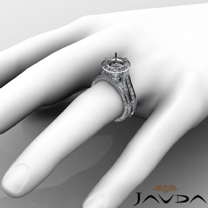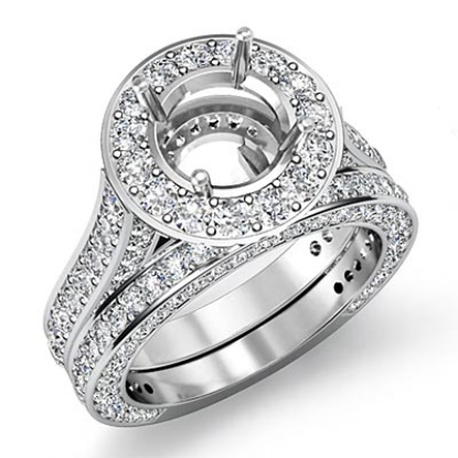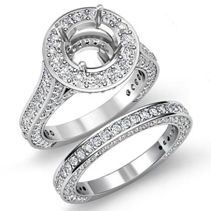 Inspired by vintage design, this halo pave set, semi mount engagement ring comes with an equally gorgeous matching band. Made in 18k Gold White, this bridal set will be the perfect choice. (3.45Ct. tw.)