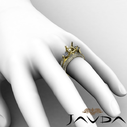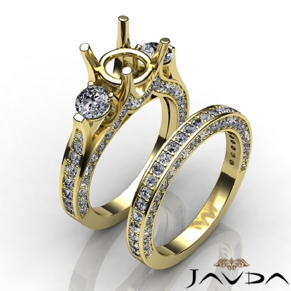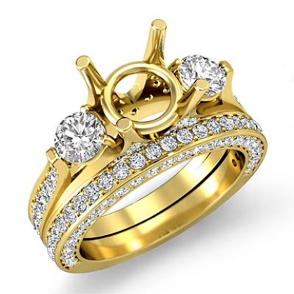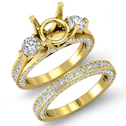 Glamorous and elegant, this three-stone semi mount ring triples the shimmer with two round cut side stones and pave set diamonds decorating the shank. Made in 14k Gold Yellow, this bridal set comes with a matching band. (3Ct. tw.)