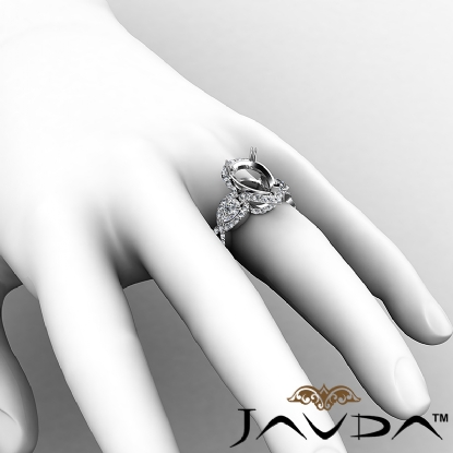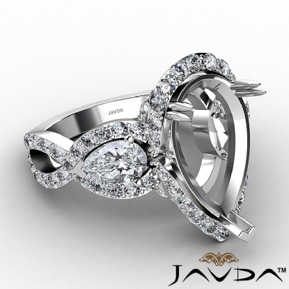 Elegant 3 stone cross shank pear semi mount diamond engagement ring made from Platinum 950. This diamond ring features total round diamonds along the cross shank and crown halo in a pave setting.