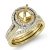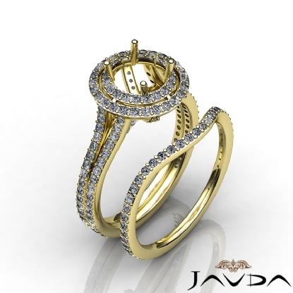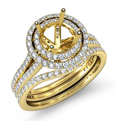An elegant creation, this 14k Gold Yellow bridal set features, round pave diamonds in double halo and along the split shank looking stunning! This engagement ring comes with a matching band, weighing a total of . (2.2Ct. tw.)