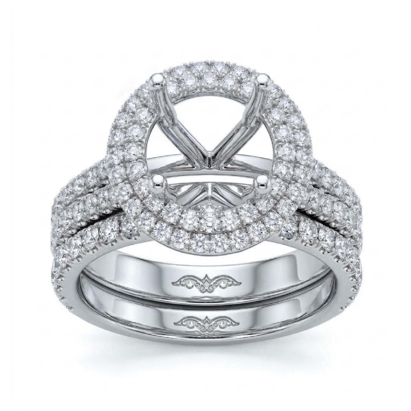 Diamond Halo Pave Setting Engagement Ring Round Bridal Set 18k W Gold (2.2Ct. tw.)