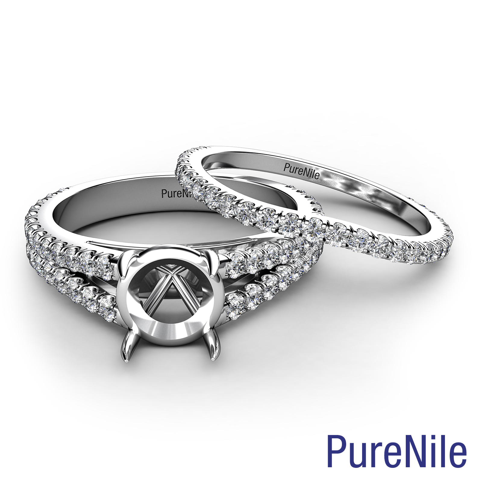The magnificent round diamond bridal set engagement ring crafted in quality 18k Gold White. This bridal ring showcases round cut semi mount with diamonds in a delicate french U split pave setting on beautiful split shank and wedding band. Available in white gold, yellow gold, rose gold and platinum. (1.1Ct. tw.)