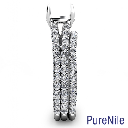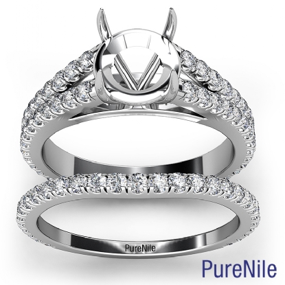 The magnificent round diamond bridal set engagement ring crafted in quality Platinum 950. This bridal ring showcases round cut semi mount with diamonds in a delicate french U split pave setting on beautiful split shank and wedding band. Available in white gold, yellow gold, rose gold and platinum. (1.1Ct. tw.)