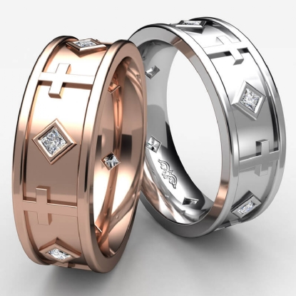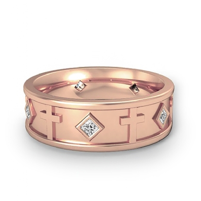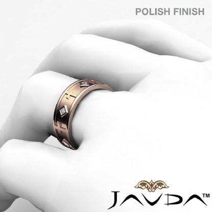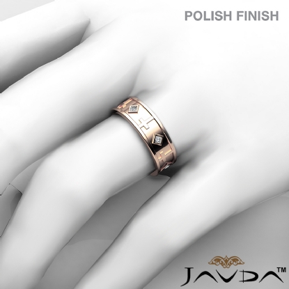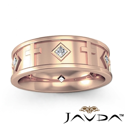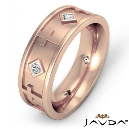 Unique & stylish cross design men's diamond eternity wedding band is made from solid 14k Rose Gold. This wedding ring showcases polished finish cross design with princess cut diamonds set in a bezel setting.