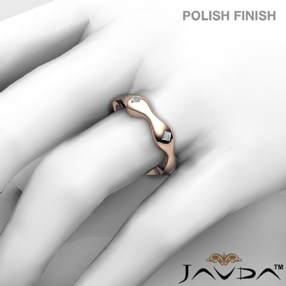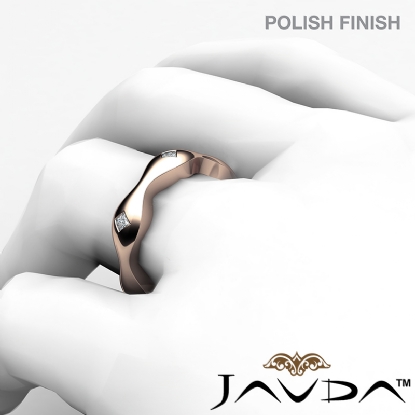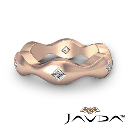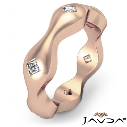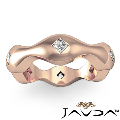 The unique and stylish wave design princess diamond men's eternity wedding band is crafted in 14k Rose Gold. Featuring this wedding ring polished finish wave design band with princess cut diamonds set in a bezel setting.