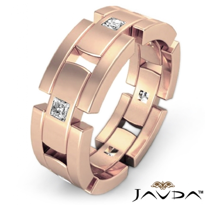The timeless block link princess diamond men's eternity wedding band is made from precious metal 14k Rose Gold. This handsome wedding ring features polished block link style with princess diamonds in a bezel setting.
