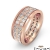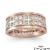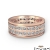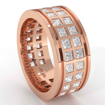 Elegant double row princess diamond men's eternity wedding band is made from solid 14k Rose Gold. This handsome wedding ring features polished flat edge with princess diamonds in a bezel setting.