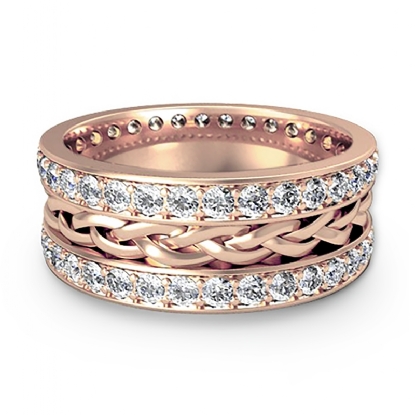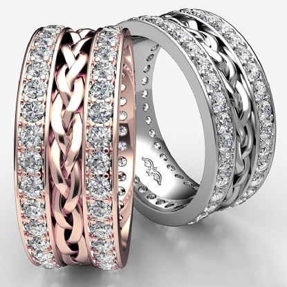 A handmade braided design men's diamond eternity wedding band is made from 14k Rose Gold. Featuring yellow gold braided design in the center and pave set round diamonds beautifully set with white gold.