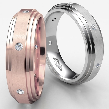 The brushed finish diamond eternity men's wedding band crafted in 14k Rose Gold. This ring features polished step edges in yellow gold and brushed finish center in white gold with round cut diamonds in a bezel setting.