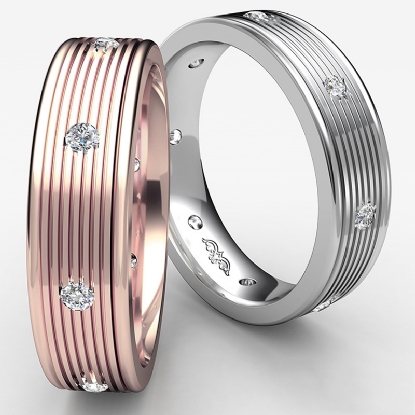 This 6mm diamond eternity men's wedding band made from 14k Rose Gold. Showcasing polished round edges in yellow gold and center parallel grooves in white gold with round cut diamonds in a bezel set.