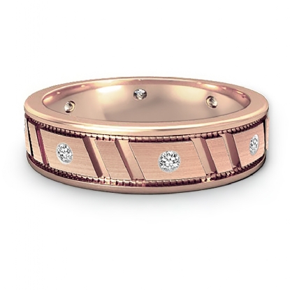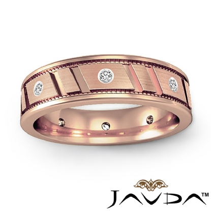 Simple and traditional, this men's diamond eternity wedding band made from 14k Rose Gold. Featuring polished finish round edges in yellow gold and brushed finish center in white gold with vertical cut grooves and round diamonds in a bezel set.