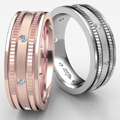 The luxurious men's diamond eternity wedding band crafted in 14k Rose Gold. Featuring polished center with round cut diamonds in a bezel set and the edges in yellow gold that give the ring a sophisticated designer look.