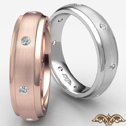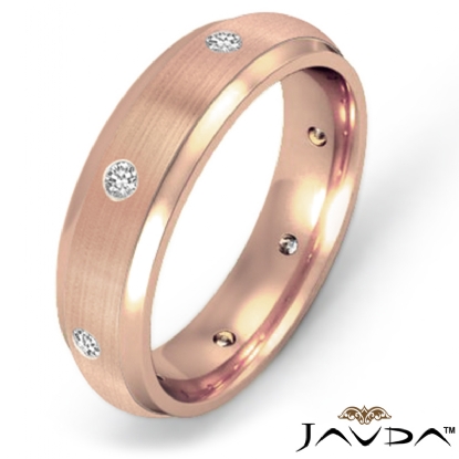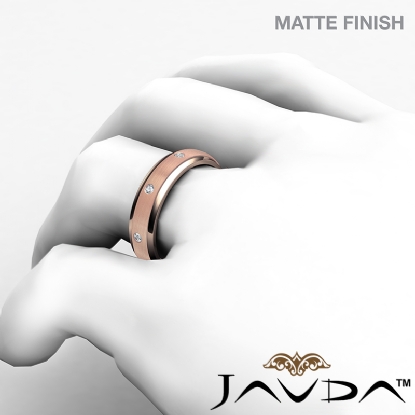 The classic design men's diamond eternity wedding band made from solid 14k Rose Gold. This 6mm band features yellow gold polished step edges and white gold matte finish center with round cut diamonds in a bezel set.