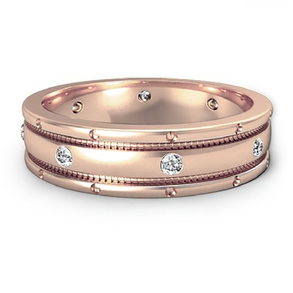 A bold and handsome design men's diamond eternity wedding band crafted in 14k Rose Gold. This wedding ring features yellow gold polished edges and white gold center dome with round cut diamonds in a bezel set.
