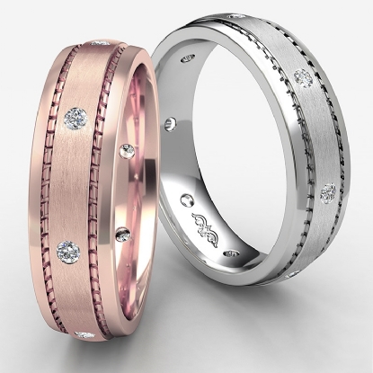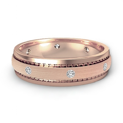 The solid men's diamond eternity wedding band made from 14k Rose Gold. This wedding ring features yellow gold polished edges and matte finish white gold center with round cut diamonds in a bezel set.