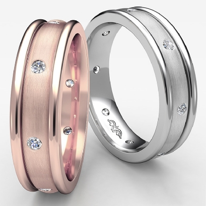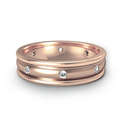 The modern men's diamond eternity dome wedding band made from 14k Rose Gold. This ring showcasing polished finish white gold dome center and yellow gold round edges with round cut diamonds in a bezel setting.