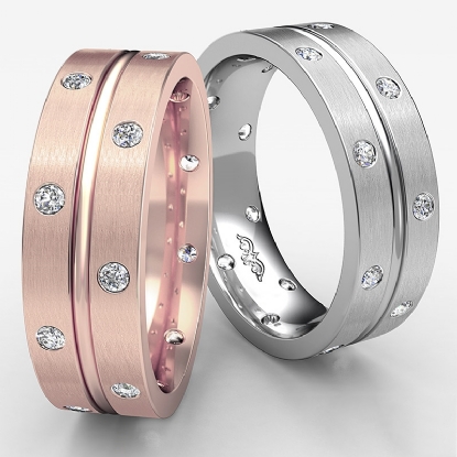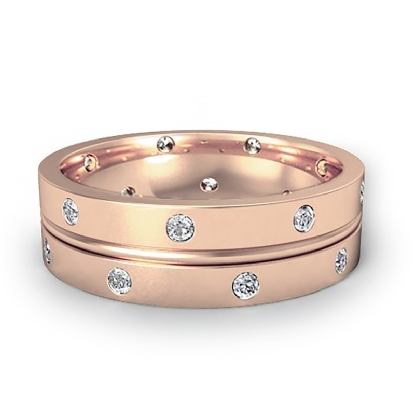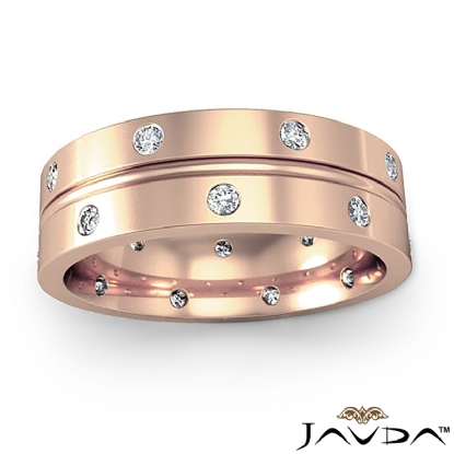 The polished finished diamond eternity men's wedding band is made from 14k Rose Gold. This solid wedding ring features center thin line in yellow gold and round diamonds set in a bezel setting. This 6mm ring is comfort fit and available in 14k & 18k 2 tone gold. (0.35Ct. tw.)