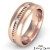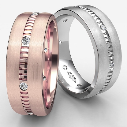 This stunning men's diamond eternity wedding band is made from 14k Rose Gold. The timeless gold ring features white gold dome edges and vertical cuts in yellow gold with round diamonds set in a bezel setting. Available in 14k & 18k 2 tone gold. (0.16Ct. tw.)