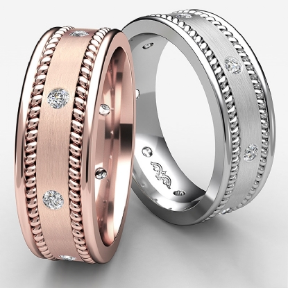 This modern diamond eternity men's wedding band crafted in 14k Rose Gold. Featuring highly polished rope edges in yellow gold with round diamonds set in a bezel setting.
