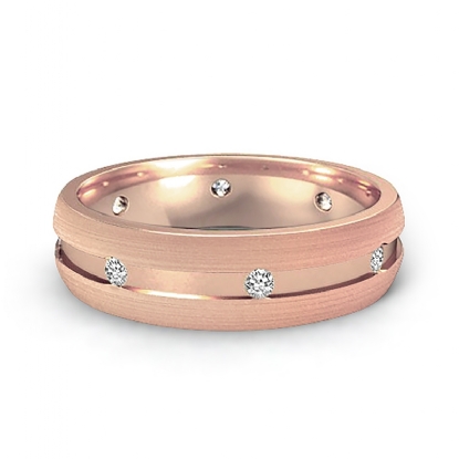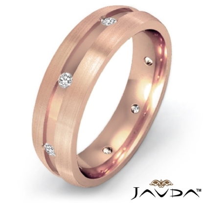 This solid 14k Rose Gold men's diamond eternity wedding band is comfort fit. Featuring matte finish sides and polished center with round diamond in a bezel set.