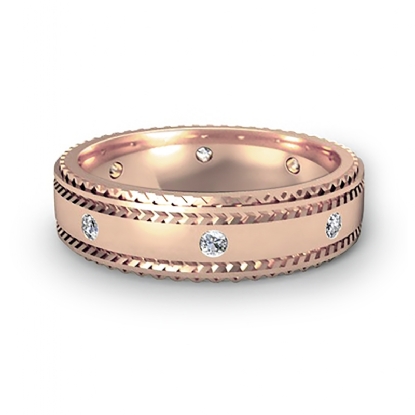 The modern diamond eternity men's wedding band crafted in 14k Rose Gold. This band featuring polished finish and carved step edges with round cut bezel set diamonds in a center.