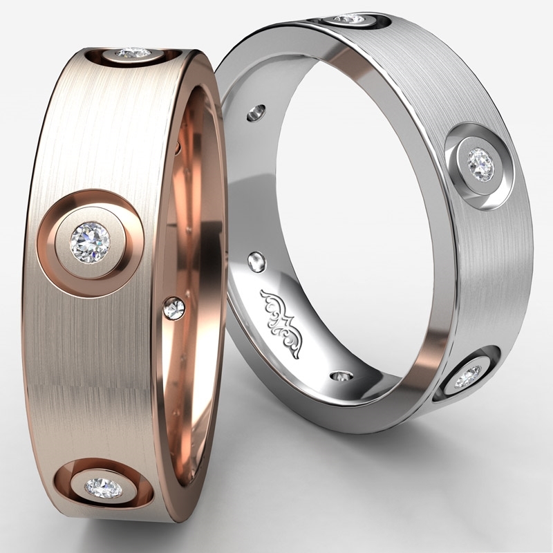 The designer diamond eternity men's wedding band crafted in 14k Rose Gold. This unique ring features round cut diamonds set in a bezel setting.