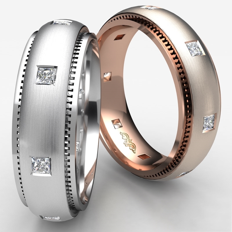 diamond eternity men's wedding band made from 14k Rose Gold. This ring features matte finish center and milgrain edges with princess cut diamonds set in a bezel setting.