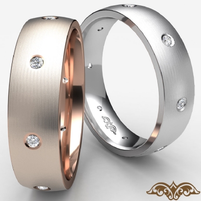 Low dome matte finished diamond eternity men's wedding band made from 14k Rose Gold. This solid ring features total round diamonds set in a bezel setting.