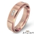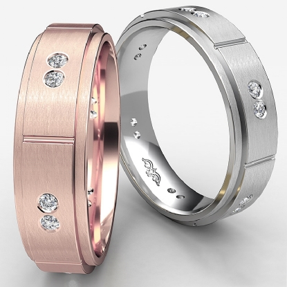 This stunning men's eternity wedding band made from 14k Rose Gold. The ring has a matte finished center and polished step edge with total round diamonds set in a bezel setting.