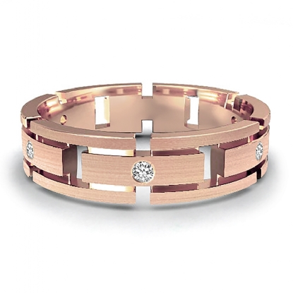 Handsome matte finished bezel set diamond men's eternity wedding band crafted in 14k Rose Gold. This ring features solid link, each link is adorned with a beautiful diamond set in a bezel setting.