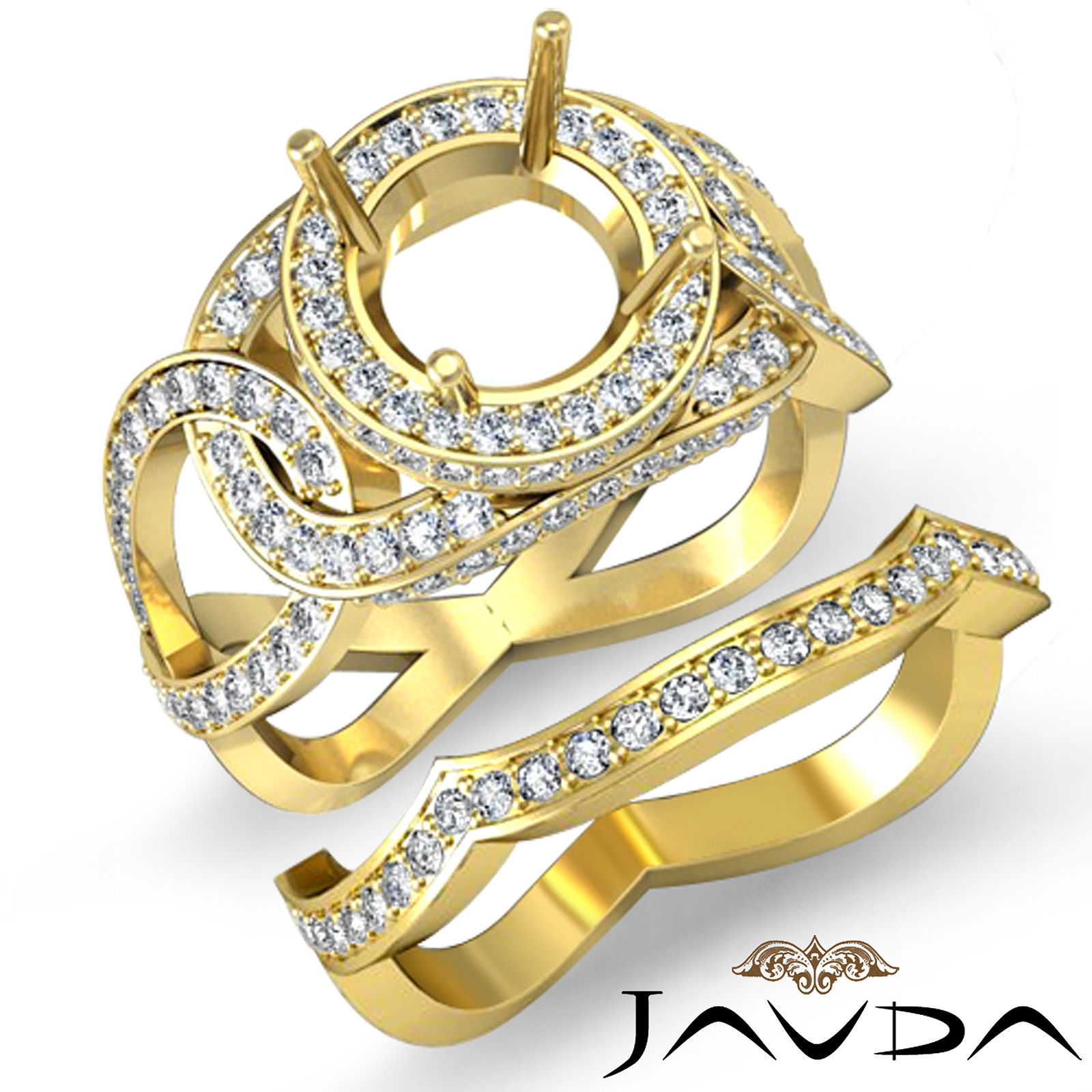 Classic with a twist, this 14k Gold Yellow semi mount engagement ring features pave set round diamonds along the halo and the shank. The matching band of this bridal set looks stunning as well. Total weight of the set is . (1.7Ct. tw.)