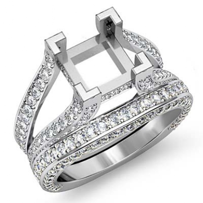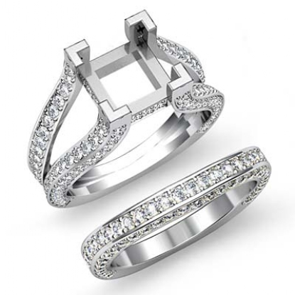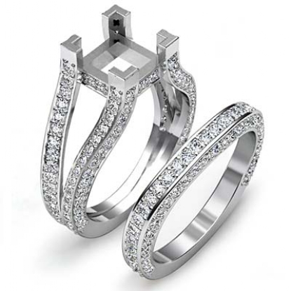 How gorgeous is this princess semi mount engagement ring with pave set round diamonds in split shank! This 18k Gold White complete bridal set comes with a matching band with a total weight of . (2.3Ct. tw.)