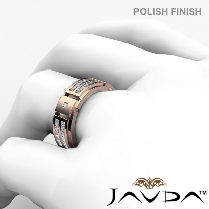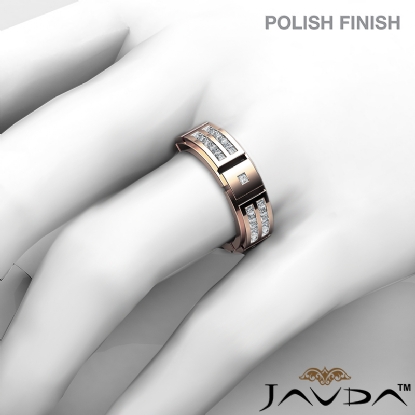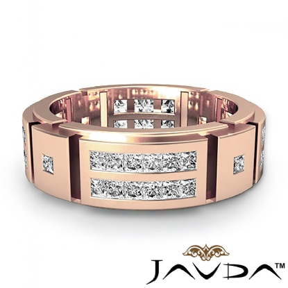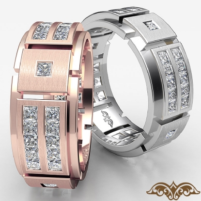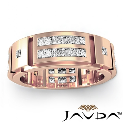 A stunning 2 row men's princess diamond eternity wedding band is crafted in quality 18k Rose Gold. Featuring this ring polished finished with vertical grooved and princess diamonds in a channel setting.