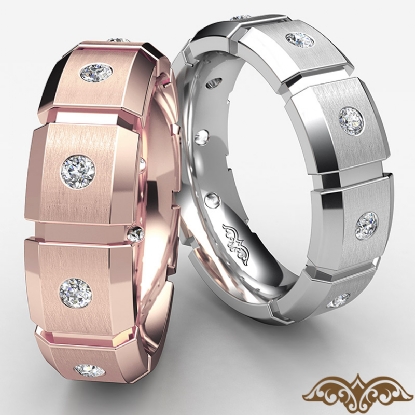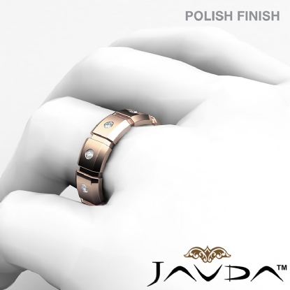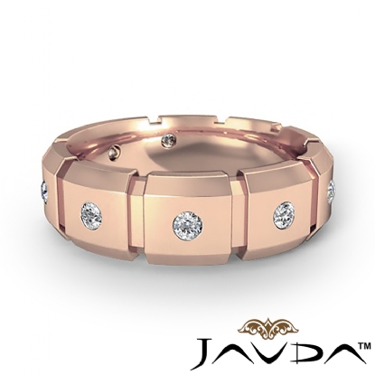 A stunning block link round diamond men's eternity wedding band is made from solid 18k Rose Gold. Featuring polished finished beveled edge and block link with round diamonds in a bezel setting.