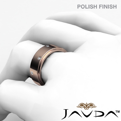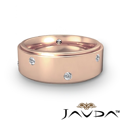 A touch of classic flat men's diamond eternity wedding band is made from solid 18k Rose Gold. Featuring polished finish flat edge and center with round diamond in a bezel setting.
