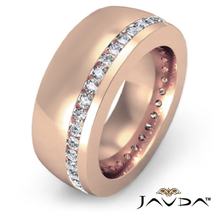 Elegant looking offset channel round diamond men's eternity wedding band is made from precious metal 18k Rose Gold. Featuring polished finish dome band with round cut diamonds set in a channel setting.