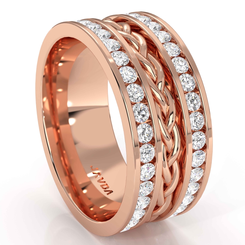 The fashionable handmade braided design men's diamond eternity wedding band is made from 18k Rose Gold. This ring features yellow gold braided design in center and round diamonds set in a channel setting.