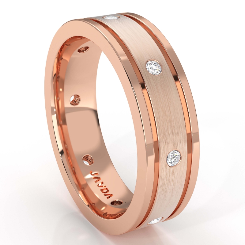 A stylish diamond eternity men's wedding band crafted in 18k Rose Gold. Featuring highly polished flat edges with round diamonds set in a bezel setting.