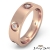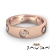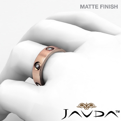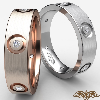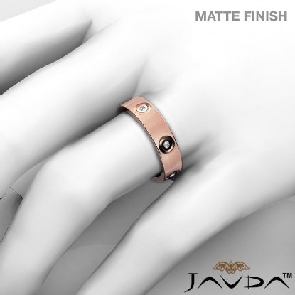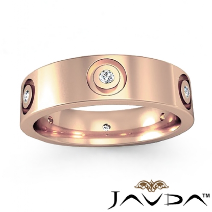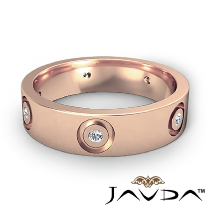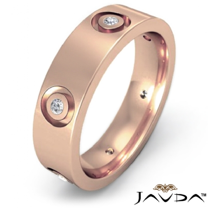 The designer diamond eternity men's wedding band crafted in 18k Rose Gold. This unique ring features round cut diamonds set in a bezel setting.