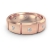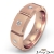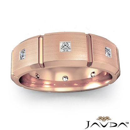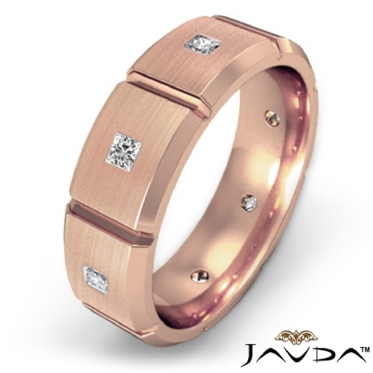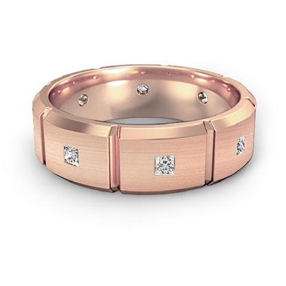 This comfort fit diamond eternity men's wedding band made from 18k Rose Gold. Featuring matte finished center with vertical cuts and polished beveled edges.