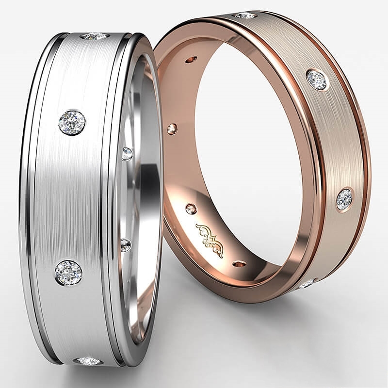 Solid 18k Rose Gold matte finished diamond eternity men's wedding band. This wedding ring features parallel grooves with total round diamonds set in a bezel setting.