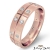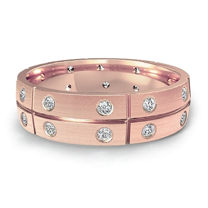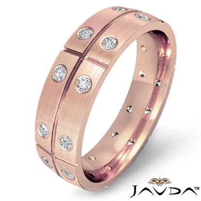 This horizontal & vertical grooves eternity men's wedding band crafted in 18k Rose Gold. Featuring matte finished with total round diamonds set in a bezel setting.