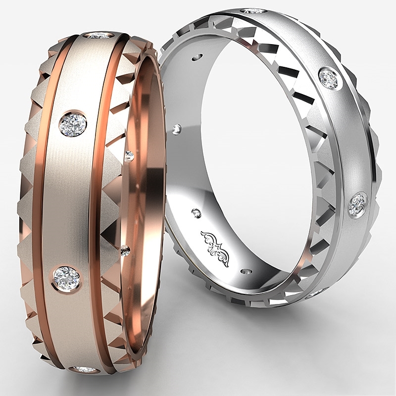 This unique design matte finished men's diamond eternity wedding band made from solid 18k Rose Gold. Featuring triangle cut edges with total round diamonds in a bezel setting.