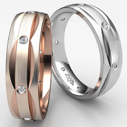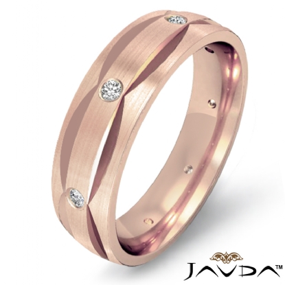 This carved design matte finish men's eternity wedding band made from 18k Rose Gold. Featuring total round diamonds set in a bezel setting.