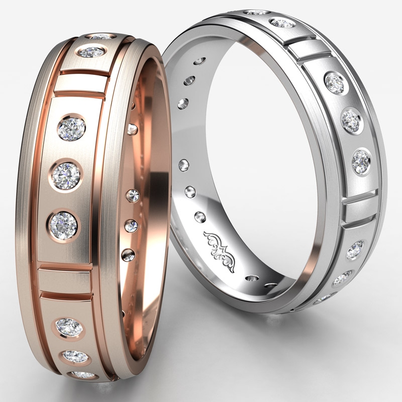 Solid matte men's eternity wedding band made from 18k Rose Gold. The ring has a parallel grooved with center cut and total round diamonds set in a bezel setting.