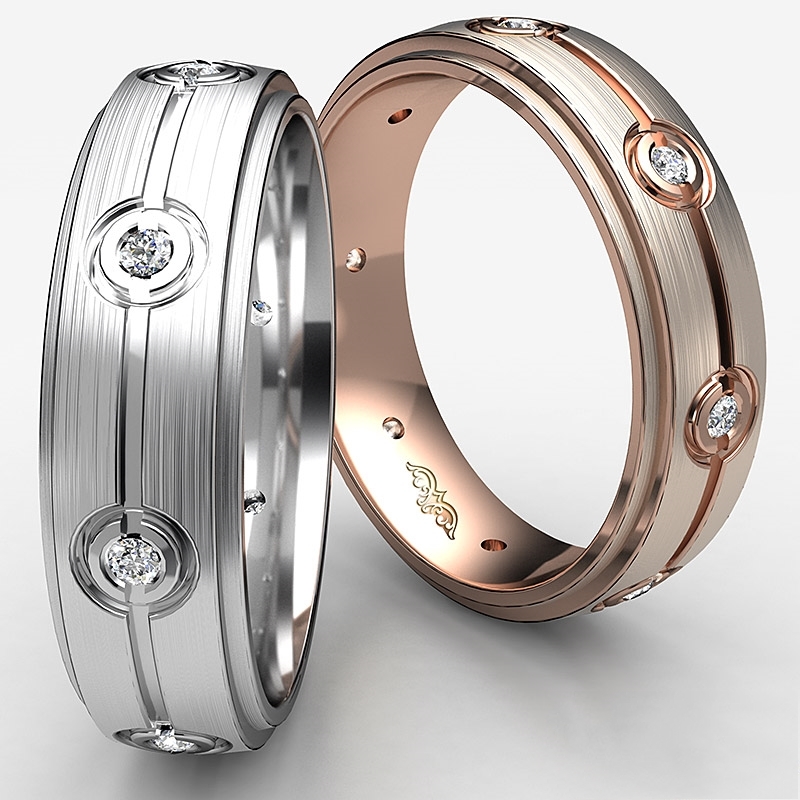 This matte finished men's diamond eternity wedding band crafted in 18k Rose Gold. Featuring step edge & center grooved with total round diamonds are set in a bezel setting.
