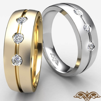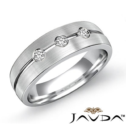 The modern look matte finish diamond men's half wedding band is crafted in Platinum 950. This wedding ring features matte finished with center grooved and 3 stone round diamonds set in a bezel setting.