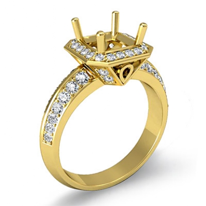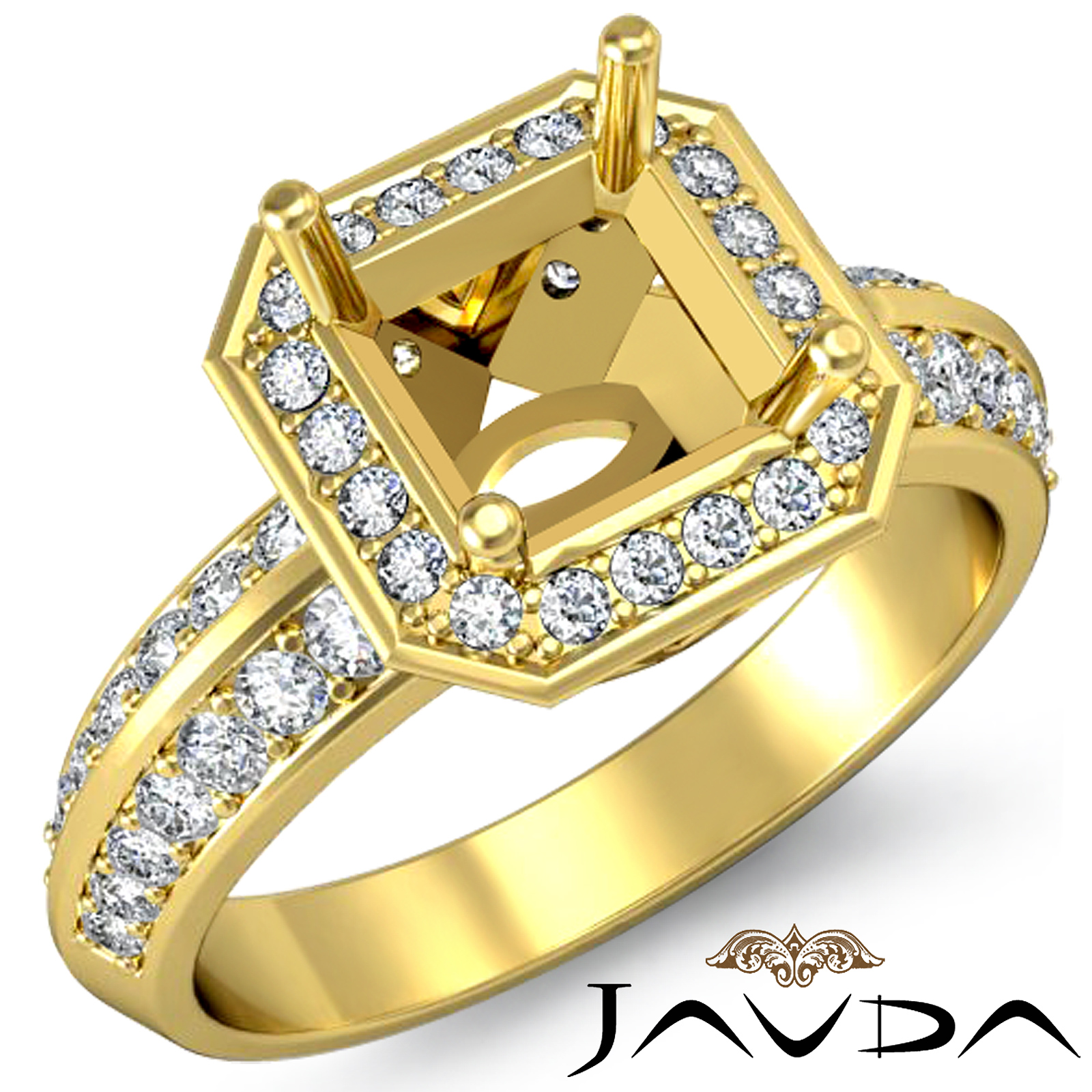 Eyes will be fixated on this one! This asscher semi mount engagement ring is made in 18k Gold Yellow. It features pave set round diamonds in halo & along the shank. (1Ct. tw.)