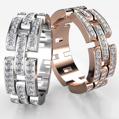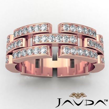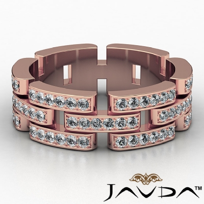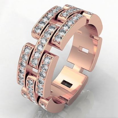 An handsome chain link men's diamond eternity wedding band made from quality 14k Rose Gold. This hot wedding ring features 1.3 carat round diamonds in a micro pave setting beautifully set on chain link pattern.