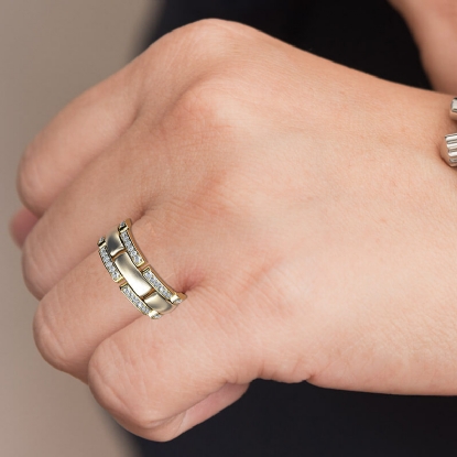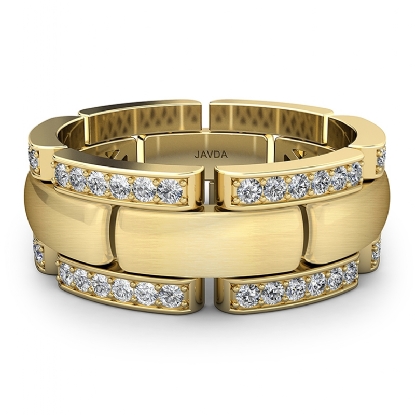 Modern chain link men's diamond eternity wedding band made from high quality 14k Gold Yellow. This handsome wedding ring features polished finished center in white gold and diamonds in a micro pave setting beautifully set on yellow gold edges. Available in 14k & 18k white gold, yellow gold, rose gold and platinum 950. (0.75Ct. tw.)